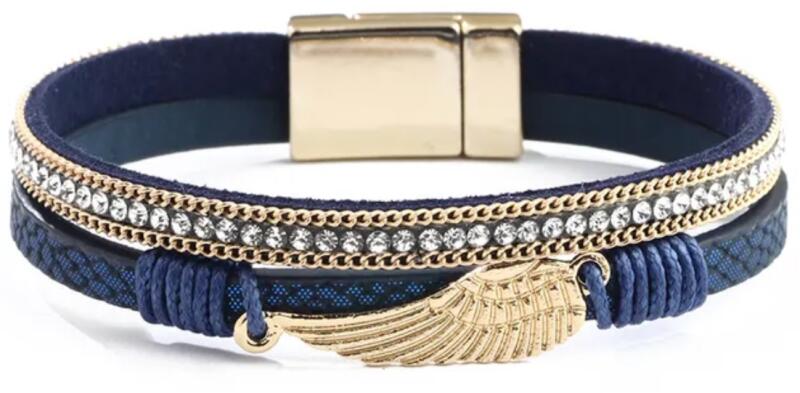Angel Wing karkötő Ez az elegáns karkötő arany színű angyalszárny motívummal a modern nők ideális kiegészítője, akik szeretnék kihangsúlyozni egyediségüket és stílusukat. A finom csillogó kövek és a luxus arany dizájn kombinációja exkluzív megjelenést kölcsönöz a karkötőnek. Az angyalszárny a védelmet, tisztaságot és a spirituális kapcsolatot szimbolizálja, a