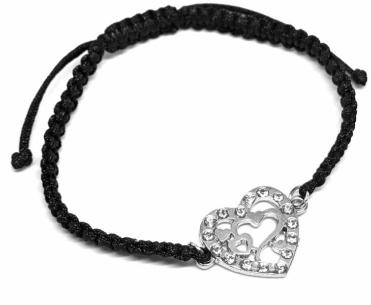 Ezüst színű kristályos Szív díszes karkötő, fekete makraméval. Paraméterek: Charm mérete 2,6x2 cm. Anyaga fémötvözet és kristály, karkötő anyaga szövet, mérete állítható. Romantikus, letisztult ékszer, kristályos szív medál egyszerű karkötővel, mégis, ez a legkülönlegesebb ajándék.