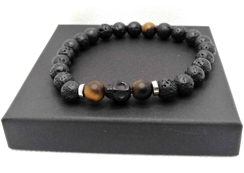 Ez egy gyönyörű egyedi tervezésű férfi ásványkarkötő lávakővel és matt tigrisszem gyönggyel illetve egy matt lávakő koponyával.