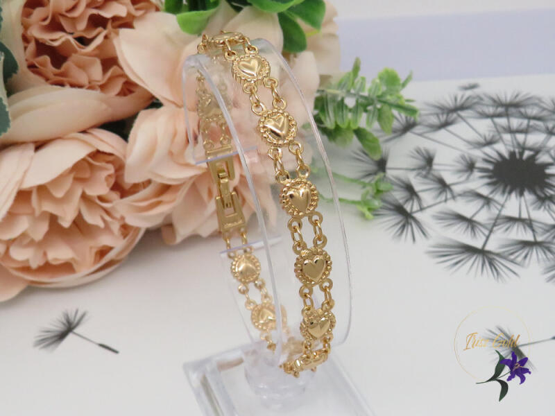 Gold Filled gyönyörű szívecske szemekből álló karkötő Szin: 18K Méret: 17cm/6mm A forgalmazott divatékszerek alapanyaga nikkel és ólommentes ezért többnyire nem okoznak allergiás tüneteket, nyugodtan hordhatják fémérzékeny emberek is. Általában nem színezik a bőrt és más divatékszerekhez képest nagyságrendekkel jobb kopásállósággal rendelkeznek. A fehér (ezüst)