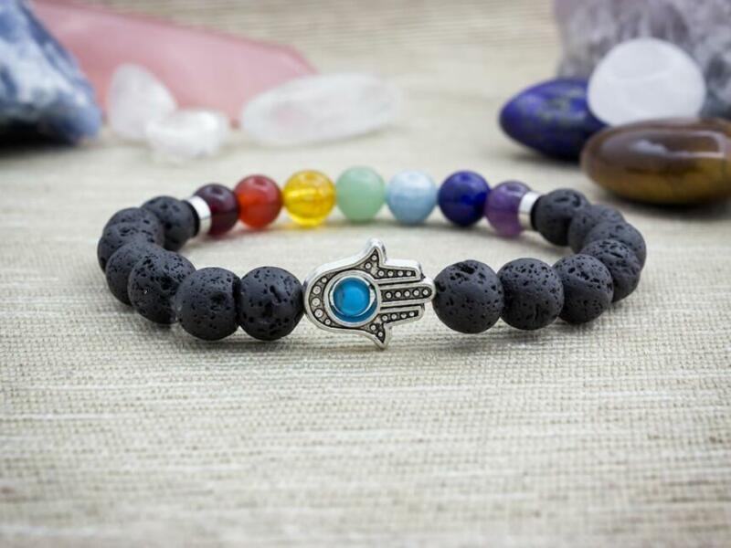 8 mm-es lávakő ásvány gyöngyökből speciális gumira fűzött ezüst színű Hamsa kezes medállal díszített karkötő. Csakra karkötő ásványai: achát, karneol, citrin, aventurin, akvamarin, lápisz lazuli, ametiszt. A karkötő alapja lávakő. Figyelem! Az ásványokat, kristályokat az őskor óta használják a test, a lélek és az érzelmek harmonizálására. Az ókori kultúr