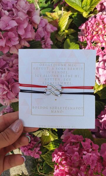 Gyönyörű egyedi, szerelmi zsinór karkötő végtelen jellel. A mérete csúszócsomókkal állítható. Az üzenetet, amit a kártya tartalmaz, megadhatod te számunkra, a vásárlási folyamatban, a "Megjegyzés" rovatban.
