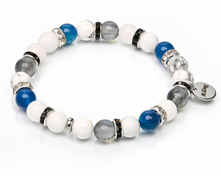 Gyönyörű osztrák kristály, jáde, howlit és ónix achát exkluzív ásvány karkötő, kifinomult elegancia és diszkrét csillogás. A Maria King kollekció kiemelt darabja. Figyelem! A képen exkluzív kivitelű, rugalmas karkötő látható kapocs nélkül, de kérheted extra erős acélsodronyra is delfinkapoccsal és 5 cm hosszabbítólánccal. Ha a kapcsos verziót kéred, ami nem szak