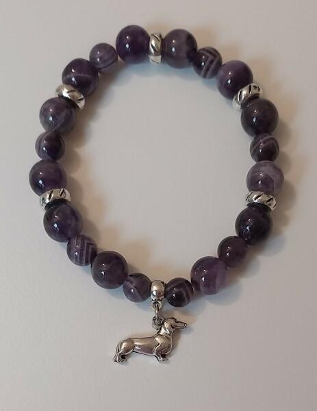 Ametiszt ásványból készült női karkötő ezüst színű tacskó medállal Gyöngyök mérete: 8 mm-es ásványgyöngyök Rugalmas, gumis ékszerdamil alapra készült Az Ametiszt ásvány az egyik legerősebb és leghatékonyabb ásványunk, a 12 mesterkristály egyike. A Korona csakra és a Homlok csakra köve. Csillagjegyei: Szűz, Nyilas, Vízöntő, Halak, Kos Az ékszerek természetes