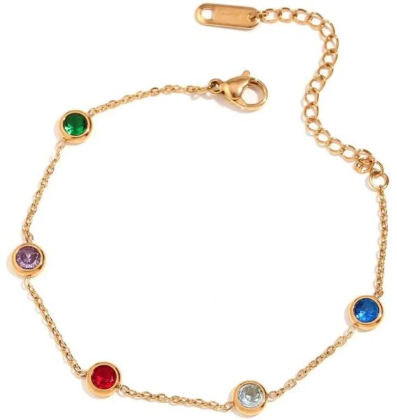 Emberly karkötő Elbűvölő karkötő színes cirkónia ékkövekkel, amely a finom szépség és ragyogás megtestesítője. A vékony arany láncon szimmetrikusan vannak a különböző színű cirkónia ékkövek elhelyezve, amelyek kifejező és játékos megjelenést kölcsönöznek a karkötőnek. Minden cirkónia ékkő elegánsan van elhelyezve az arany foglalatban, ami még inkább kiem