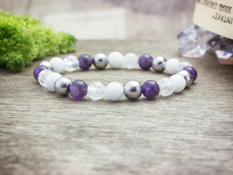 Jáde, ametiszt, hematit és roppantott hegyikristály ásványokból fűzött gumis karkötő. Amit a jádéról érdemes tudnod: A Jáde egy gyűjtőcsoportja a kövek egy fajtájának. Lelki gyógyhatása: Több örömmel és életkedvvel ajándékoz meg minket. Növeli a bennünk lévő szeretetet, a harmónia iránti igényünket. Testi gyógyhatás: Szabályozza a szervezet sav-bázis egyens