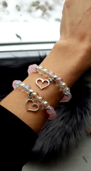 Gyönyörű szívecske medálos rózsakvarc és tündöklő szivárványos átlátszó hegyikristály ásványokból készített karkötőpár Anya és Lánya részére, mely a szeretetet és az össze tartozást jelképezi az Édesanya és lánya között. A termék ára egy pár (2 db) karkötőre vonatkozik. Ehhez a termékhez ajándék díszdoboz jár.