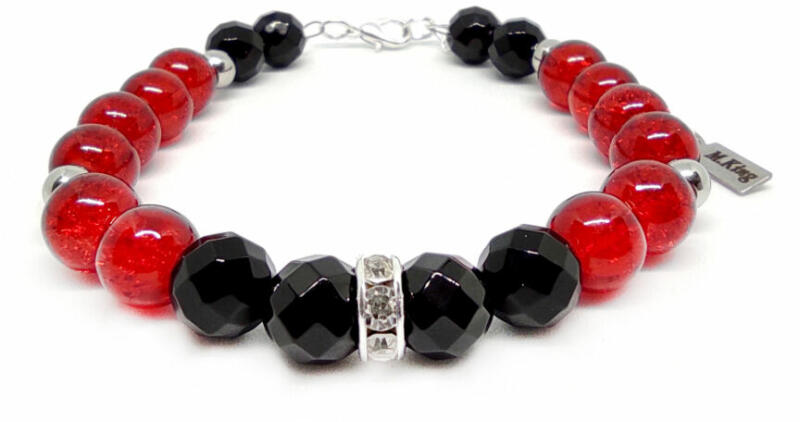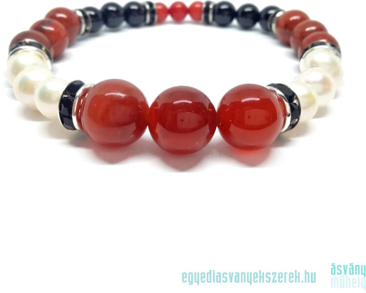 Figyelem! Nem szakad, nem nyúlik! Tartós ékszer. Kérheted csat nélküli rugalmas gumidamilra is. Amennyiben rugalmas damilra kéred, Megjegyzésbe írd be rendeléskor, hogy csat helyett rugalmas gumidamilt kérsz, és a csuklód körbemért méretét is írd meg. Az ékszer ásványai és tartozékai: – 8 mm-es fazettált Ónix ásványgyöngyök – 8 mm-es roppantott piros Hegyikrist