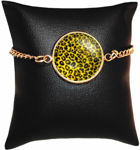 Leopárd sárga üveglencsés karkötő, választható arany és ezüst színben. Egyedi, szép, kézzel készült üveglencsés ékszer, akár ajándékba is ideális. Válasz d ki a listából, hogy arany vagy ezüst színben, és milyen méretben kéred, vagy írd be rendeléskor a MEGJEGYZÉSBE. Az alapár 17 cm-es karkötőt tartalmaz. Paraméterek : A minta alapja fém, rajta domború üveg
