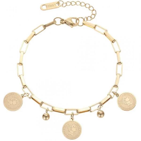 Elizabeth karkötő Ez a figyelemfelkeltő karkötő, amely érmeként formázott medálokkal díszített, a kifinomult és vintage stílus megtestesítője. A robusztus láncszemes lánc modern, ugyanakkor időtlen megjelenést kölcsönöz, míg az érmeként formázott medálok, amelyek történelmi motívumot ábrázolnak, érdekes karaktert adnak a karkötőnek. A medálok között elhelyezke