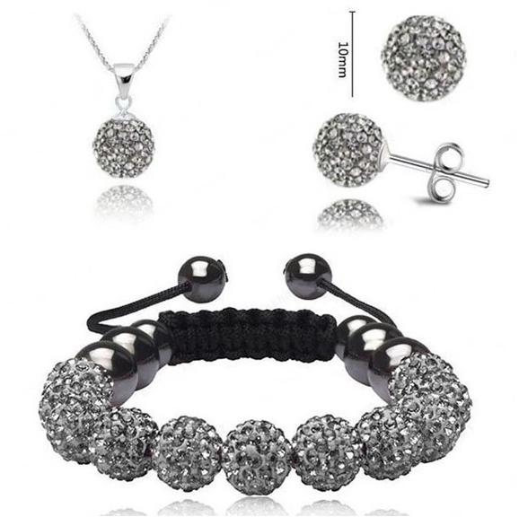 Swarovski kristályos szett. Nyaklánc, medál, karkötő, fülbevaló. SzürkeSwarovski kristályokkal díszített, szett. Nyaklánc medállal, állítható méretű karkötő és fülbevaló. Alkalmi és mindennapi öltözethez. TULAJDONSÁGOKSzürke szín Swarovski kristály állítható méret nyaklánc, medál, fülbevaló, karkötőMÉRETEKgömbök átmérője: 1 cm nyaklánc hossz: állíth