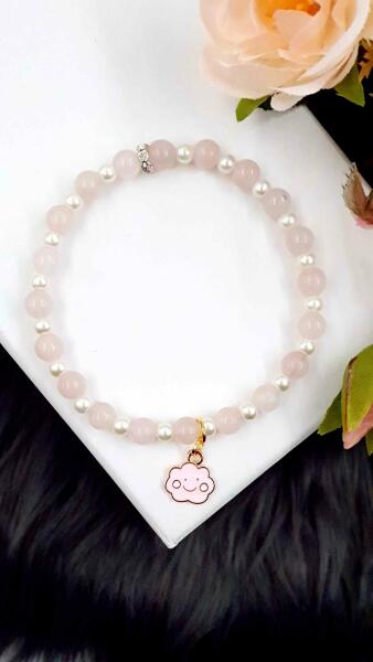 Gyönyörű "Felhőcske" ásványkarkötő rózsakvarc ásványból és gyöngyházszín gyöngyökből készítve, felhőcske medállal díszítve.