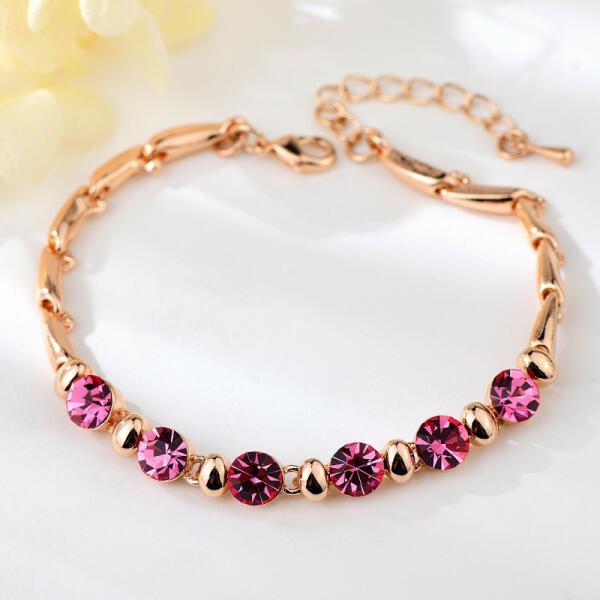 Cikkszám: 0598 Karkötő: - rózsaarany bevonattal, - kiváló minőségű rózsaszín mesterséges kristályokkal. Hossza: 18 cm + 3,5 cm (állítható). Szélessége: 0,6 cm. Súlya: 16 g. Alapanyaga: minőségi fémötvözet. Különleges, nagyon szép ékszer ! A megadott méreteket kérjük vegyék figyelembe !
