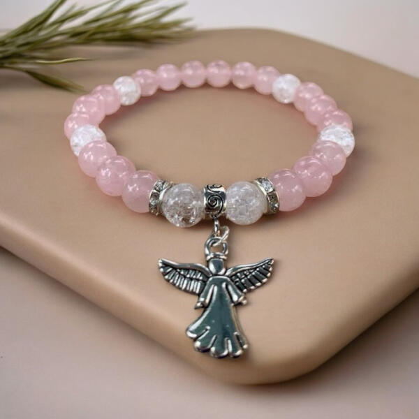 A gyöngyök átmérője: körülbelül 8mm Rózsakvarcból és Roppantott hegyikristályból készült, ezüst közökkel és angyal medállal diszített, tisztaságot és harmóniát árasztó karkötő. A medál hosszúsága: körülbelül 1,8cm Nem tudod, hogyan válassz csuklóméretet?Kattints ide és segítünk! Kizárólag minőségi ásványokból készítve! Ingyenes dísztasakban érkez