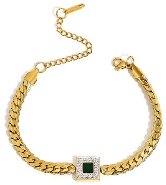 Rosalin Karkötő Rosalin karkötő szépen struktúrált lánccal és a medálját díszítő zöld ékkővel az elegancia és kifinomultság csúcsa. Klasszikus kialakítása apró cirkónia ékkövekkel díszített, amik kihangsúlyozzák szépségét és a karkötőnek fényűző csillogást biztosítanak. Az arany színe meleg hatást ad, valamint könnyen kombinálható különféle öltözk