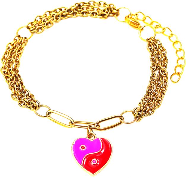 Három soros divat karkötő pink-piros szív alakú jin-jang charmmal, arany színű. Paraméterek: Charm mérete kb. 1,5 cm. Anyaga fémötvözet, karkötő anyaga rozsdamentes acél. Karkötő mérete 17+5 cm. (Ha ettől eltérő méretet szeretnél, rendeléskor a MEGJEGYZÉSBE írd be. )