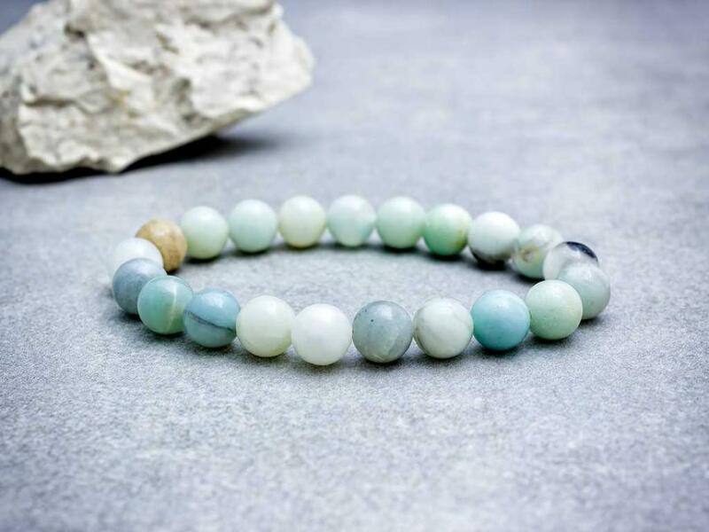 Az amazonit golyók gumira vannak felfűzve. Amit az amazonitról érdemes tudnod: Az amazonit nagyrészt átlátszatlan kő, esetleg halvány tejfehér felhőkkel a világoszöldtől a kékes-zöldön keresztül a sötét zöldig/kékig. Ezt a követ mostanában méltánytalanul mellőzik, pedig sokféle hasznos gyógyhatással bír. Lelki gyógyhatás: Az amazonit nyugtató hatással bír az ide