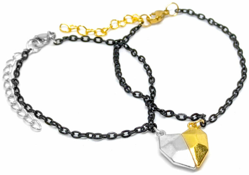 Mágnese s Szív charmos páros karkötő. A két szív fél összekapcsolódik mágnessel, nagyon menő :-). Paraméte rek: Szív teljes mérete 1,8x2 cm. Anyaga fémötvözet, karkötők anyaga rozsdamentes acél. Karkötők mérete 17+5 cm. (Ha ettől eltérő méretet szeretnél, rendeléskor a MEGJEGYZÉSBE írd be. )