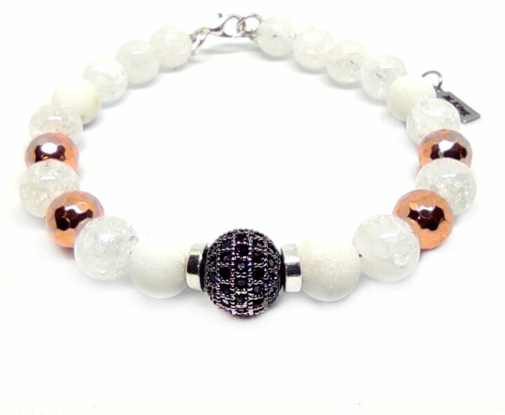 Figyelem! Nem szakad, nem nyúlik! Tartós ékszer. Kérheted csat nélküli rugalmas gumidamilra is. Amennyiben rugalmas damilra kéred, Megjegyzésbe írd be rendeléskor, hogy csat helyett rugalmas gumidamilt kérsz, és a csuklód körbemért méretét is írd meg. Az ékszer ásványai és tartozékai: – 8 mm-es fazettált rózsaarany Hematit ásványok – 8 mm-es matt fehér Jade ásv