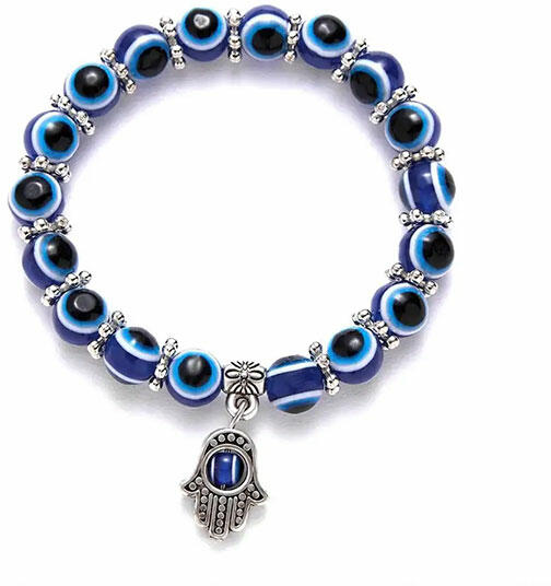 A Védelmező kék szemek karkötője a Hamsa kéz erőteljes szimbólumával van ellátva, amely ősidők óta az isteni védelem és a rossz energiák távol tartásának jelképét hordozza. A Hamsa kéz, más néven Fatima keze, egy ősi amulett, amelyet a világ számos kultúrájában és vallásában használnak a negatív energiák és a balszerencse elhárítására. A karkötő kék szí