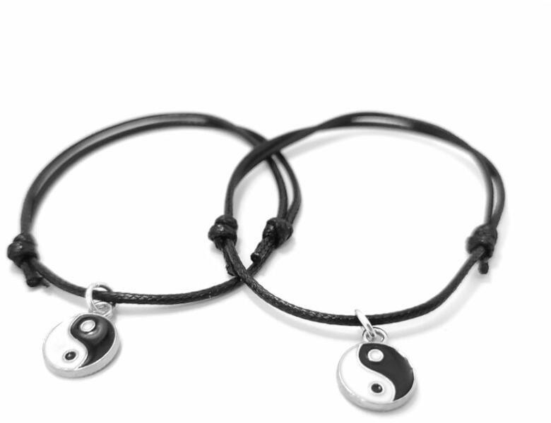 Fekete zsinórszövet karkötő jin-jang charmmal, 2 db. Paraméterek:. Charm mérete kb. 1,5 cm. Charm anyaga fémötvözet. Karkötő anyaga textil.