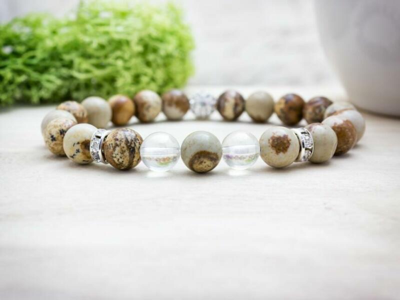 A jáspis és aurakvarc ásvány golyók gumira vannak felfűzve. Amit a jáspisról érdemes tudnod: Gyakori előfordulása és a földszínek széles skálája miatt a jáspist ősidők óta használják dísztárgyak és pecsétek készítésére. Mágikus ereje miatt is nagyra értékelték. Úgy hitték, hogy túlvilági szellemi cselszövések ellen véd és a szerelmi bánatot mérsékli. G