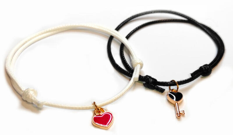 Páros zsinórszövet karkötő szív és kulcs charmmal. Paraméterek:. Charm mérete kb. 1,1 és 1,5 cm. Charmok anyaga fémötvözet. Karkötők anyaga textil.
