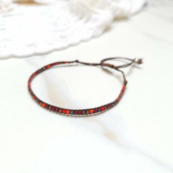 Piros, barna, bordó apró gyöngyös barna zsineg karkötő. A méretük állítható a behúzó szárakkal 15 cm-24 cm között.