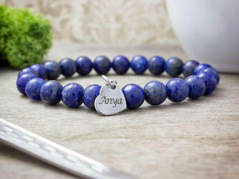 Mondd el karkötővel, hogy szereted! Valódi lápisz lazuli ásványgyöngyös fűzött gumis karkötő "Anya" felirattal gravírozott szív alakú nemesacél medállal Ezt a külön édesanyák részére készített ajándék ötlet ünket 8 mm-es lápisz lazuli ásványgyöngyök alkotják . A karkötőt egy szív alakú 10×11 mm-es méretű szolídan elegáns acél medál is díszíti egyik