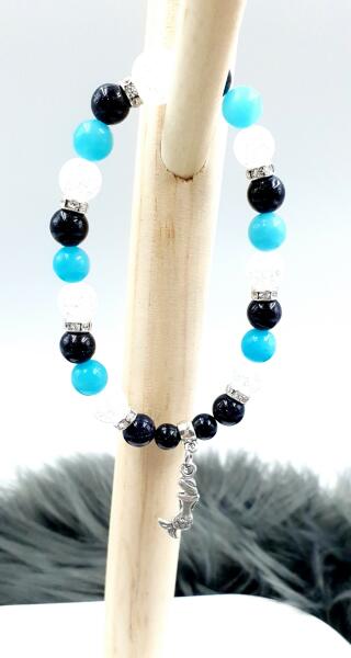 Gyönyörű csiszolt, 8mm átmérőjű "Kék sellő ásványkarkötő, mely sötétkék csillogó napkőből, kék kvarcból és roppantott hegyikristályból készült, apró sellő medállal.