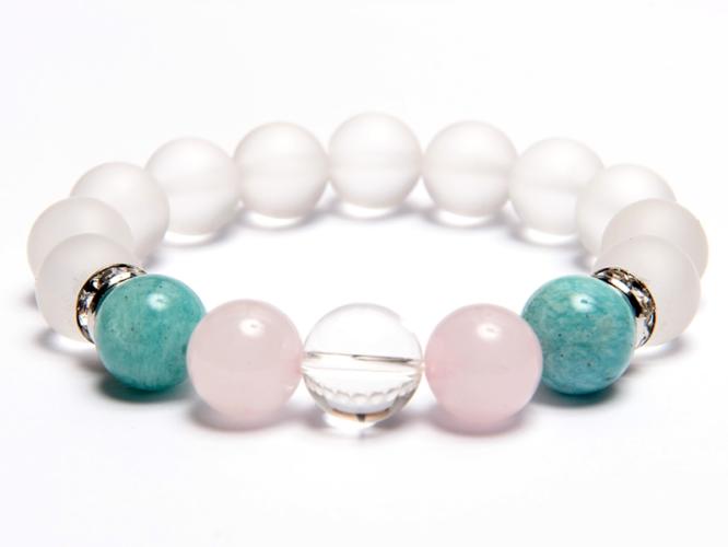 A karkötő 10 mm-es rózsakvarc, amazonit, matt és fényes hegyikristály ásványgömbökből készült gumira fűzve. A felhasznált 8 mm-es strasszgyűrű antiallergén. A karkötő méretének meghatározása : a csuklód méretéhez adj hozzá 2 cm-t. Az ásványok nem helyettesítik az orvosi diagnózist és kezelést. A rózsakvarc a bika, a hegyikristály az oroszlán és a bak, az amazo