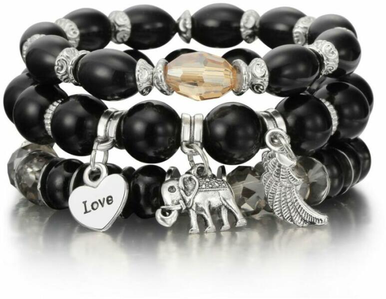 Többsoros akril karkötő szett, Love, Elefánt és Angyalszárny motívumokkal. Kedvedre variálhatod, nagyon cuki. Anyaga akril és fémövözet, rugalmas, könnyű felvenni.