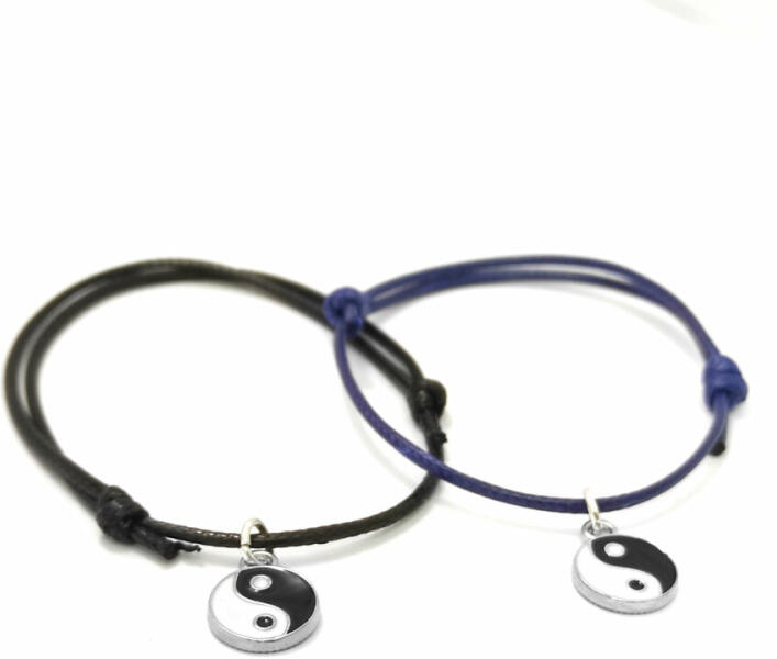 Fekete és kék zsinórszövet karkötő jin-jang charmmal, 2 db. Paraméterek:. Charm mérete kb. 1,5 cm. Charm anyaga fémötvözet. Karkötő anyaga textil.