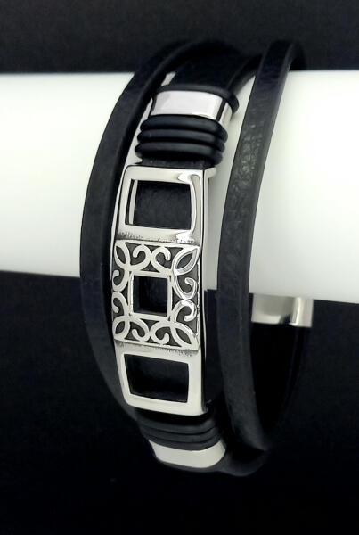 Fekete, három soros valódi bőr karkötő, nemesacél (316L) díszítéssel és csattal. Kényelmes, tartós viselet, nem feketedik. Antiallergén ékszer. Hossza: 21 cm. Szélessége: 26 mm. Egymásba csúsztatható, mágneses csattal záródik. A nemesacél ékszerek rendkívül népszerűek kedvező tulajdonságaik miatt. A nemesacél semmilyen nikkelsót nem bocsájt ki magából, ennek köv