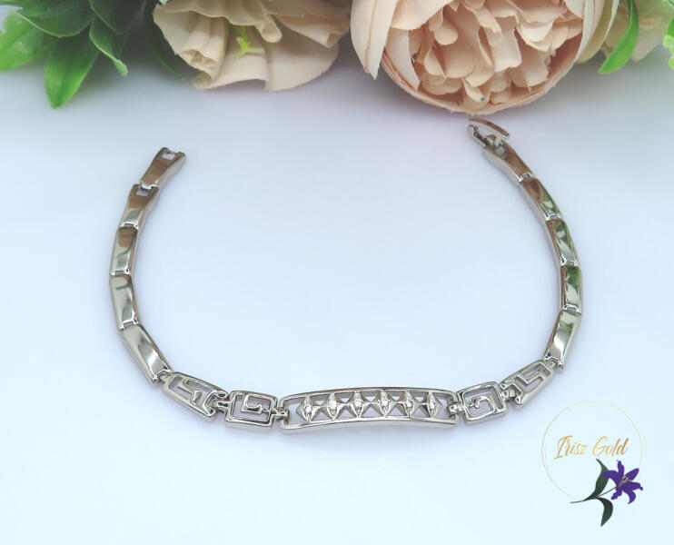 Gold Filled pici cirkóna kövekkel és görög motívummal díszített karkötő Szin: rodium (ezüst szín ) Méret: 19cm /5-6mm A forgalmazott divatékszerek alapanyaga nikkel és ólommentes ezért többnyire nem okoznak allergiás tüneteket, nyugodtan hordhatják fémérzékeny emberek is. Általában nem színezik a bőrt és más divatékszerekhez képest nagyságrendekkel jobb kopásáll