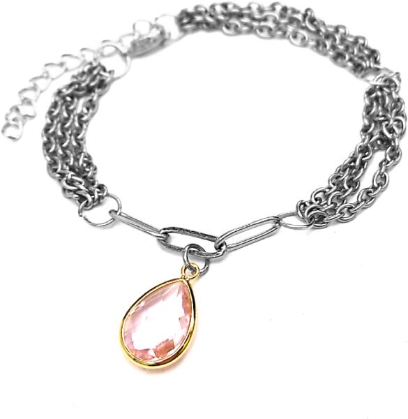 Három soros divat karkötő lila kristály csepp charmmal, ezüst színű. Paraméterek: Charm mérete 1,8 cm. Anyaga fémötvözet és kristály, karkötő anyaga rozsdamentes acél. Karkötő mérete 17+5 cm. (Ha ettől eltérő méretet szeretnél, rendeléskor a MEGJEGYZÉSBE írd be. )