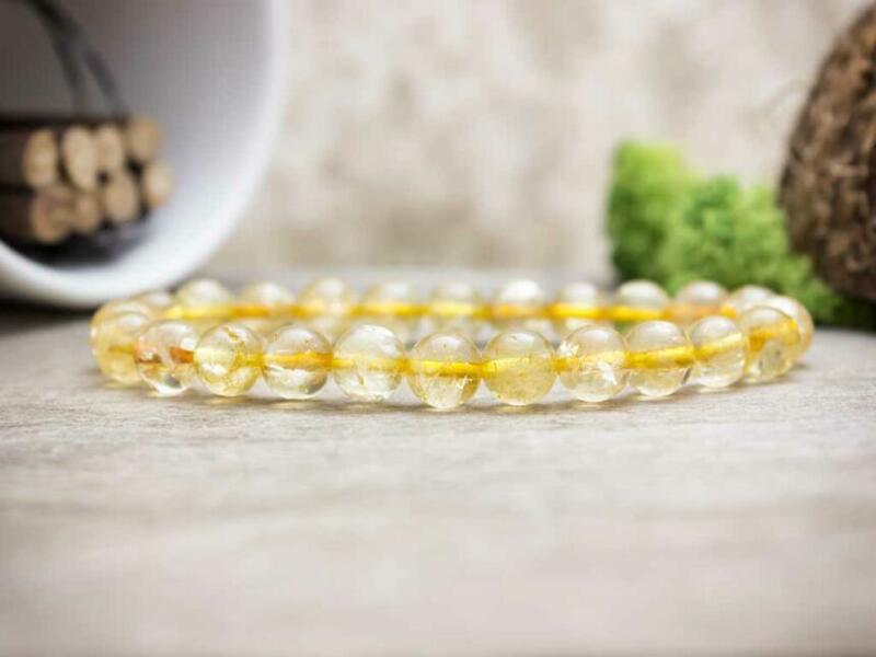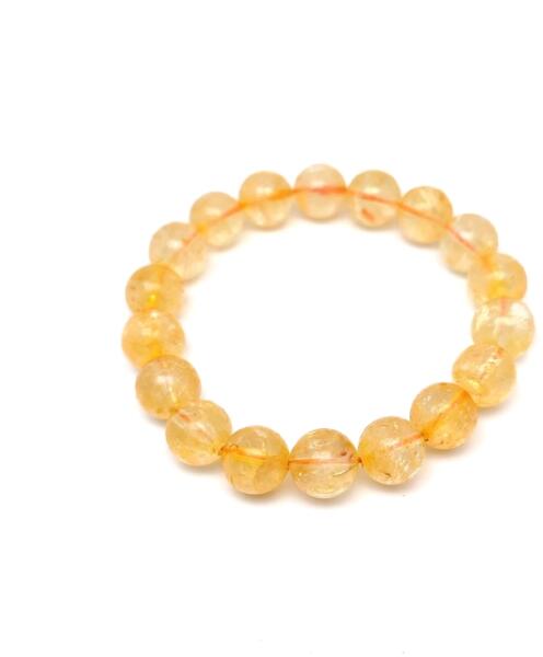 A citrin golyók gumira vannak felfűzve. Amit a citrinről érdemes tudnod: A citrin a sárgának szinte mindenféle színárnyalatát felvonultathatja. Az ásvány akkor keletkezik, amikor a kcvarot enyhe radioaktív sugárzás éri. Ritka kőről lévén szó, az értéke magas, gyakran árulnak hevített ametisztet citrin néven. Lelki gyógyhatása: A citrin védelmezi és megtisztítja aurá