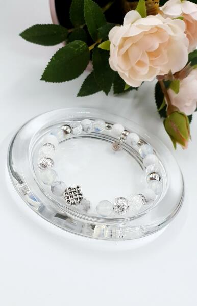 Álomszép hófehér végtelen ásványkarkötő hófehér tejkvarc, hegyikristály, howlit és holdkő ásványokból. A végtelen fonat a szeretet, a valahova való lehorgonyzás, összetartozás jelképe. Rendelhető akár párban is.