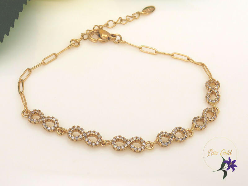Gyönyörű végtelen jeles karlánc Szin: 18 Kr Méret:17+3 cm Szélesség :4mm A forgalmazott divatékszerek alapanyaga nikkel és ólommentes ezért többnyire nem okoznak allergiás tüneteket, nyugodtan hordhatják fémérzékeny emberek is. Általában nem színezik a bőrt és más divatékszerekhez képest nagyságrendekkel jobb kopásállósággal rendelkeznek. A fehér (ezüst) színű