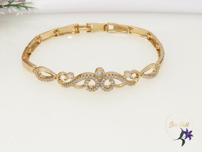Antiallergén gyönyörű közép mintával apróköves karkötő Szin: 18K Méret: 19 cm /10-0,4mm A forgalmazott divatékszerek alapanyaga nikkel és ólommentes ezért többnyire nem okoznak allergiás tüneteket, nyugodtan hordhatják fémérzékeny emberek is. Általában nem színezik a bőrt és más divatékszerekhez képest nagyságrendekkel jobb kopásállósággal rendelkeznek. A fehér