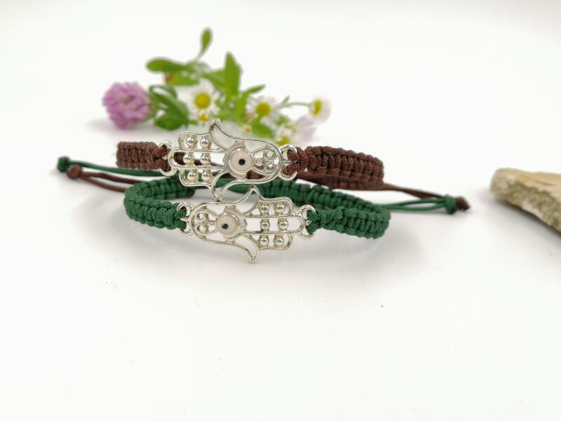 Gyönyörű egyedi, hamzsakéz medállal ellátott karkötő, mely vékony parakord zsinórból font. Az össze tartozást és a végtelen barátságot jelképezi.