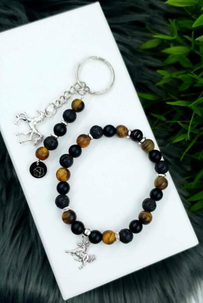 Ékszerszett, mely egy ásványkarkötőből és egy kulcstartóból áll. Lávakő, matt tigrisszem, és ónix ásványokból készült, lovas medállal, és ezüst díszítéssel.