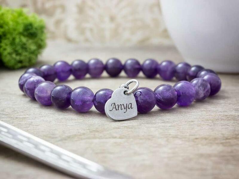 Mondd el karkötővel, hogy szereted! Valódi ametiszt ásványgyöngyös fűzött gumis karkötő "Anya" felirattal gravírozott szív alakú nemesacél medállal Ezt a külön édesanyák részére készített ajándék ötlet ünket 8 mm-es ametiszt ásványgyöngyök alkotják . A karkötőt egy szív alakú 10×11 mm-es méretű szolídan elegáns acél medál is díszíti egyik oldalán "An