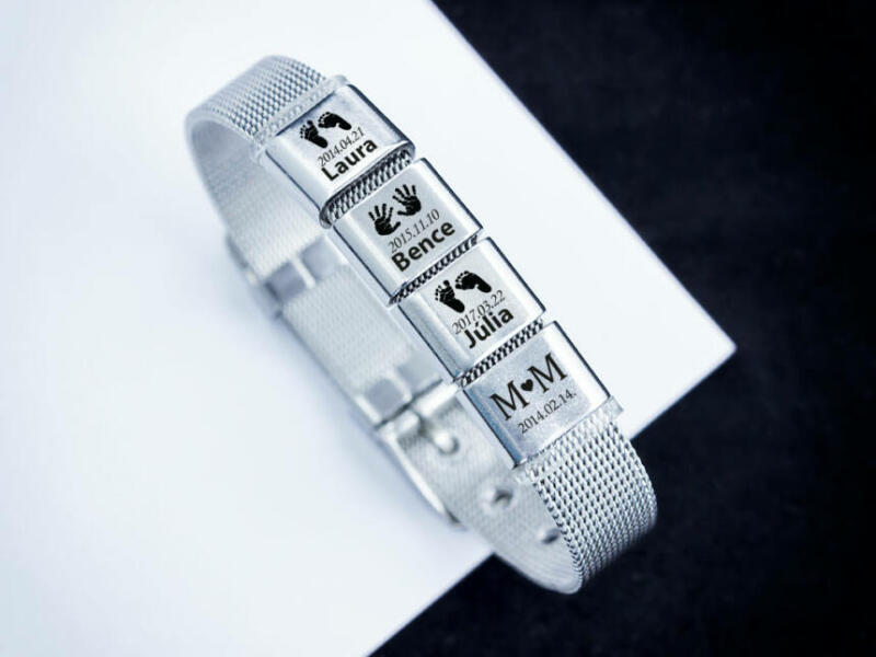 Emlékőrző ékszerben a Te varázslatod! Három medálra 3 gyermeked keresztnevét, és születési dátumát gravírozzuk! A negyedik medálra a keresztnevetek kezdőbetűjét, és egy számotokra fontos dátumot gravírozunk! (Lézer gravírozott szögletes alakú nemesacél csúszó medálok - 12×10 mm méretű) Az ár tartalmazza a gravírozás költségét. A gravírozási idő rendelést