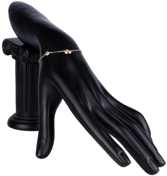 Gyerek karkötő függőlegesen összekötött ovális láncszemekből álló láncból. Egy átlátszó vágott kerek cirkónia és egy szivárvány formájú medállal, melynek mindkét végén felhőkkel van díszítve. A szivárvány íveit piros, sárga és lila máz díszíti. Az egyes színeket sima arany szegély választja el egymástól. A karkötő állítható hosszúságú, rugós gy