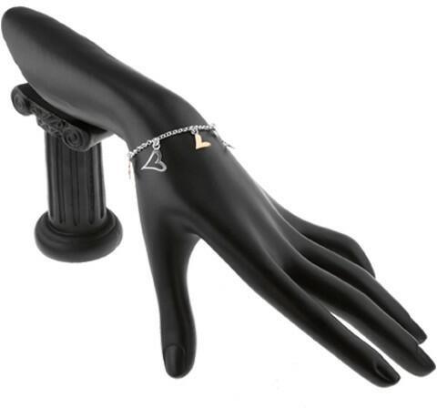 A sterling ezüstből készült karlánc alapját apró, kerek szemekből összeállított finom lánc alkotja. A láncra felváltva arany és ezüst színű, enyhén nyújtott szívecskék vannak erősítve. A négy kisebb aranyszínű szívecske teljes, az öt ezüstszínű szív kivágott. Delfinkapoccsal záródik. A karkötő hossza: 195 mm (+/- 5 %)A szívek mérete: 11 x 11 mm és 7 x 8 mmA