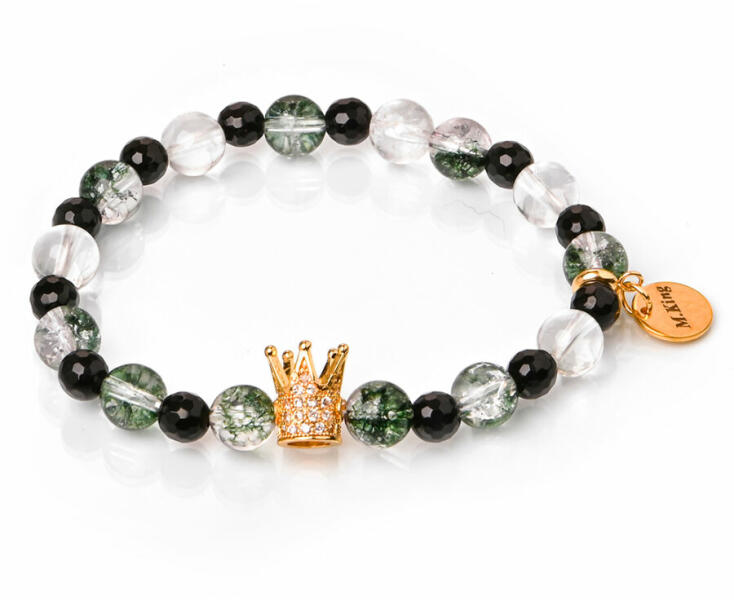 Üde, frissítő stílus, könnyed ékszer a mindennapokra, sejtelmes zöld fantomkvarc és határozott fekete obszidián, kiegészítve egy remek kidolgozású arany színű strasszos Korona dísszel. A Maria King kollekció exkluzív darabja. A korona dísz gyönyörűen kidolgozott, még tovább emeli a karkötő fényét. Figyelem! A képen exkluzív kivitelű, rugalmas karkötő látható kap