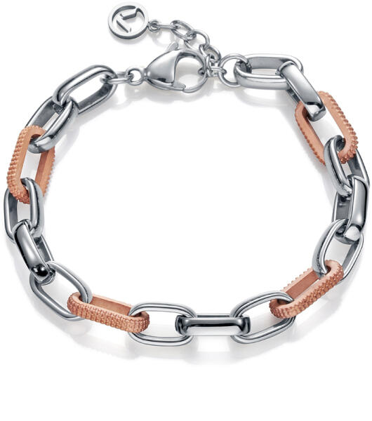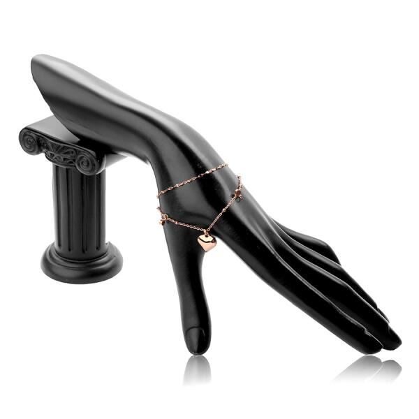 A réz színű orvosi acél karkötő kettős láncból áll, az egyik kis ovális láncszemekből áll, amelyeket kis karikák szakítanak meg, a másik pedig nagyobb ovális alakú szemekkel. A karkötőt két átlátszó, kerek cirkónia és egy szabályos, lekerekített fényes sima felületű szívű medál díszít. A karkötő hosszabbító lánccal rendelkezik, amely végét egy lemezke z