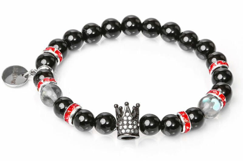 Gyönyörű ónix és osztrák kristály karkötő, különleges fekete és piros kombinációja, megkoronázva egy remekül kidolgozott cirkóniummal kirakott Korona dísszel. A szürke osztrák kristály gyöngyöktől még varázslatosabb az összhatás, vakító csillogással egészítik ki ezt a remek karkötőt. Vagány, mégis finoman nőies ékszer. Ha Korona dísz nélkül kéred a karkö
