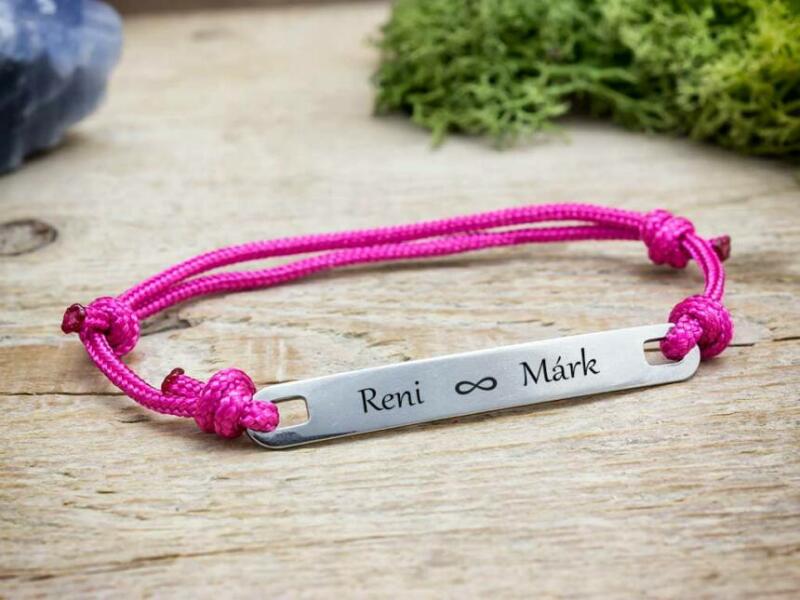 Ezt az egyszerű, de mégis egyedi karkötő ajándék ötlet ünket e gy microcord zsinór , és egy acél medál alk ot ja . A karkötőt egy lap alakú 49×6,3 mm-es méretű elegáns acél medál díszíti, amit gravírozunk , így személyesebbé téve az ajándékot . A nemesacél más néven orvosi fém medál nem allergizál , ezért fémre érzékenyeknek is bátran ajánljuk . Mindemelle